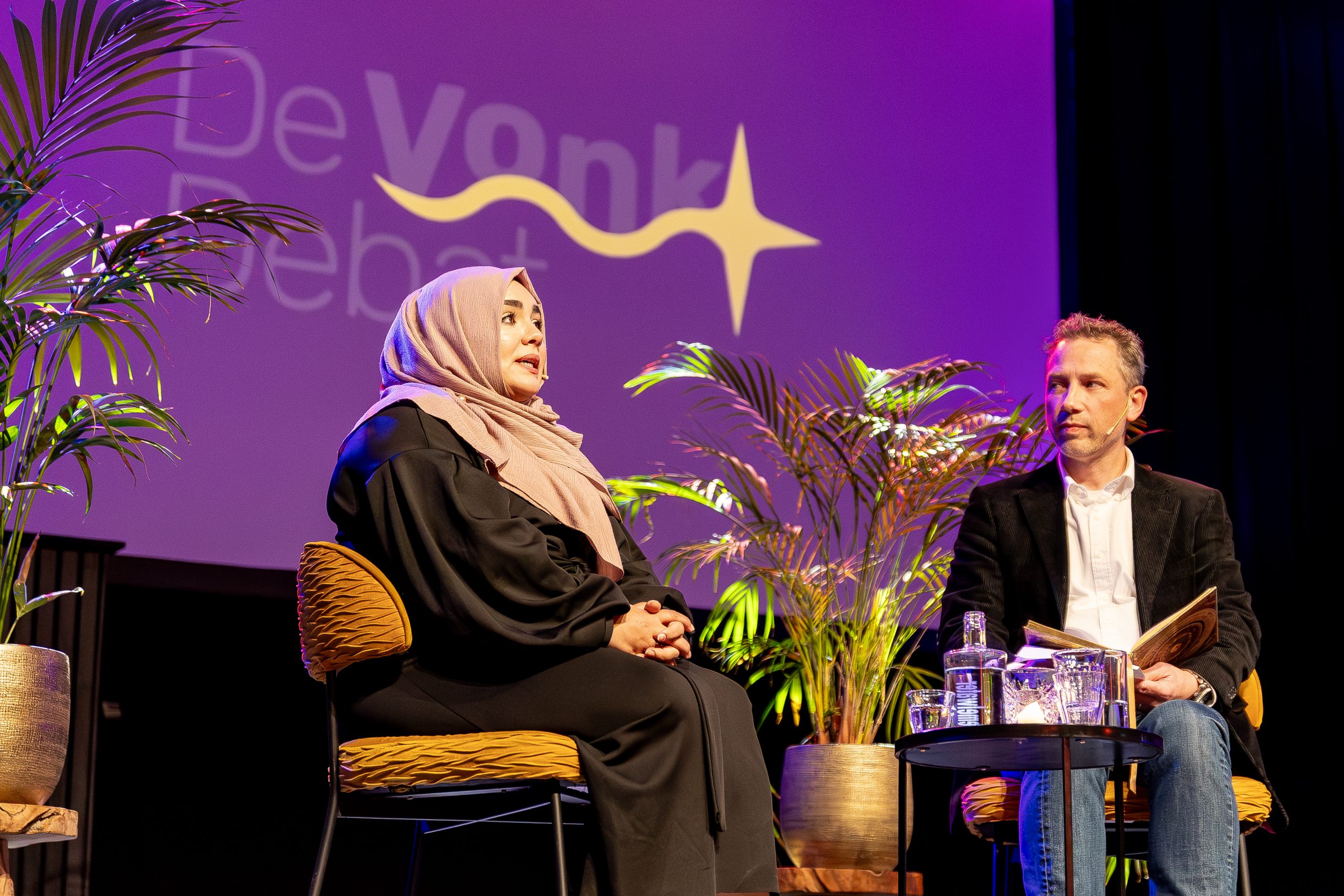 ‘Als een officier van justitie een hoofddoek draagt, verandert dat dan iets aan haar oordeel, of verandert het iets aan hoe wij haar zien?’ De prikkelende stelling vormde de inzet van het interview met Maryam El-Rahmouni tijdens Het Vonk-debat op dinsdag 11 november in de Bullekerk. Maryam – ze was drie maanden toen ze vanuit Marokko naar Nederland kwam – wilde als kind, ‘gedreven door haar gevoel van rechtvaardigheid’, officier van justitie worden: ‘Ik wilde boeven vangen’. Tijdens haar studie rechten werd haar verteld dat als ze officier of rechter wilde worden, ze haar hoofddoek af moest doen omdat in ons land op basis van het principe scheiding van kerk een staat ambtenaren met overheidsgezag neutraliteit moeten uitstralen. En daar horen geen zichtbare religieuze uitingen bij als een hoofddoek, keppeltje of kruisje.