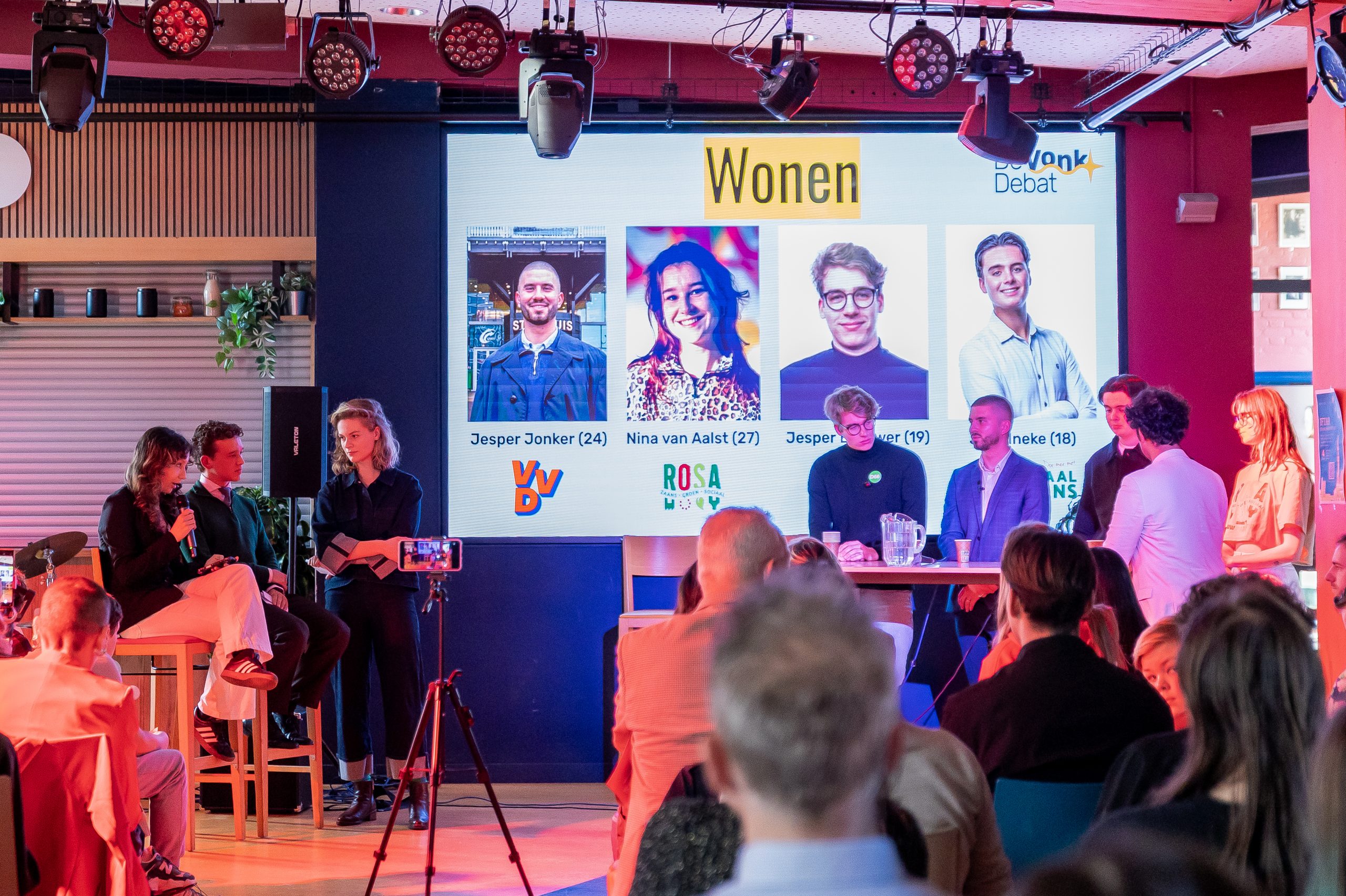 Vraag: ‘Is het een idee om jongeren en ouderen samen te laten wonen?’ Jesper, VVD: ‘Goed idee. Ik ben de politiek in gegaan om mensen te verbinden. Dit past daar wel in.’ Nina, Rosa: ‘Wonen voor werk, je ziet dat wel hier en daar.’ Jesper, D66: ‘Zorgt er wel voor dat je het woningtekort terugbrengt.’